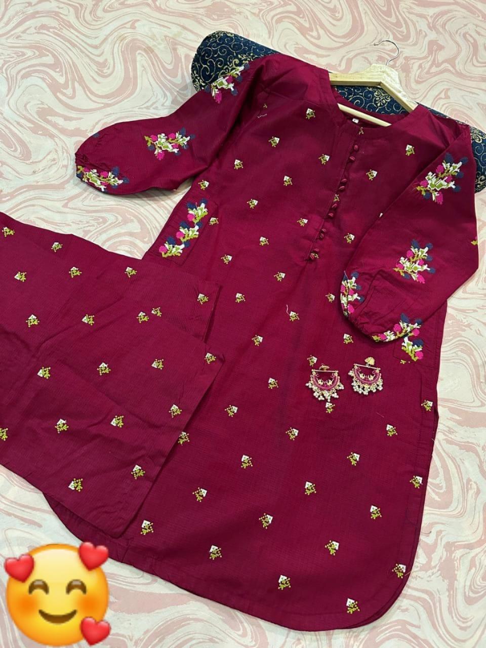 • Fabric: Cotton• Pattern: Embroidered• Neck Type: Round Neck• Shirt Pattern: Embroidered• Trouser Fabric: Cotton• Trouser Pattern: Embroidered• Product Feature: Perfect For Everyday Wear• Available Sizes: Standard Size• Number Of Pieces: 2 Pcs• Package Includes: 1 x Shirt, 1 x Trouser• Shirt Length: 38 Inches• Shirt Chest: 22 Inches• Trouser Length: 39 Inches• Color: Maroon• Front Stitch Buttons With Both Sided Pockets Embroidery Kurti With Emb Flapper 2Pcs• Size Measurement• Chest Size 21/22• Shirt Length 38• Shirt Stuff Soft Pure Cotton• Emb Flapper Length 39• Stuff Soft Pure Cotton• Note: There might be an error of 1-3 cm due to manual measurement, and slight color differences may occur as a result of varying lighting and monitor effects.• Product Code: MZ1680200277ALHNSE