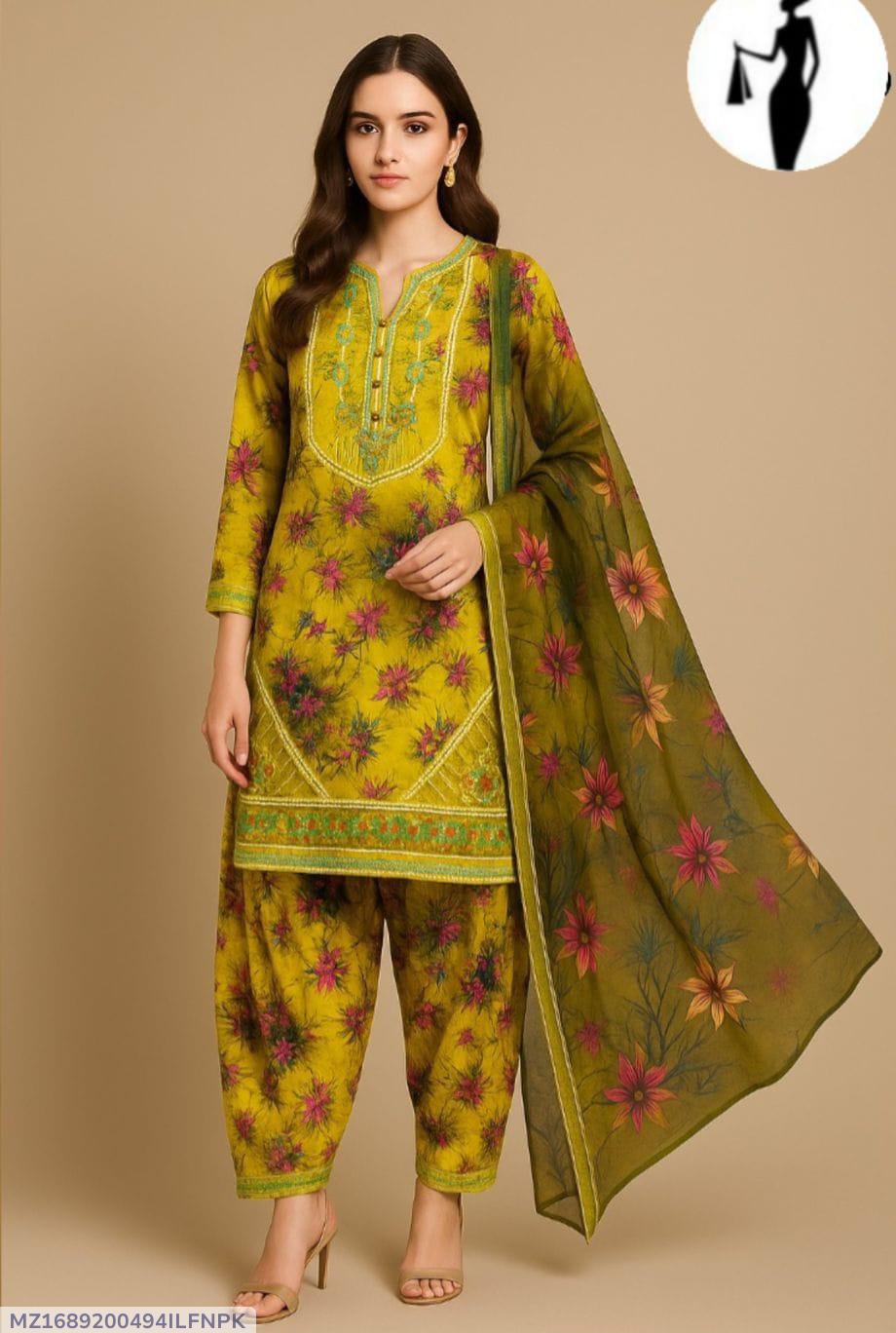 • Fabric: Lawn• Pattern: Sequins Embroidered• Neck Type: Round Neck• Shirt Pattern: Printed• Trouser Fabric: Lawn• Trouser Pattern: Printed• Dupatta Fabric: Marina• Dupatta Pattern: Printed• Available Sizes: Standard Size• Number Of Pieces: 3 Pcs• Package Includes: 1 x Shirt, 1 x Trouser, 1 x Dupatta• Shirt Length: 38 Inches• Shirt Chest: 21 Inches• Shirt Shoulder: 15 Inches• Arm Length: 11 Inches• Trouser Length: 37 Inches• Trouser Waist: 20 Inches• Trouser Hip: 23 Inches• Dupatta Dimensions: 2.5 Yards• Color: Yellow• Shalwar: Classic Farshi Style Pure Lawn Shalwar (Length: 37) for a Perfect Traditional Look• Dupatta: Soft Munar Fabric Dupatta with Four-Side Border Finish (2.5 Yards)• ? Fabric Quality:• Shirt: Pure Gentry Lawn (Guaranteed)• Shalwar: Pure Lawn• Dupatta: Munar• ? Colour Options:• Available in 6 Beautiful Colours ?• ? Size Measurements:• Shirt Length: 37 Inches (Approx)• Farshi Shalwar Length: 37 Inches• Note: There might be an error of 1-3 cm due to manual measurement, and slight color differences may occur as a result of varying lighting and monitor effects.• Product Code: MZ1689200494ILFNPK